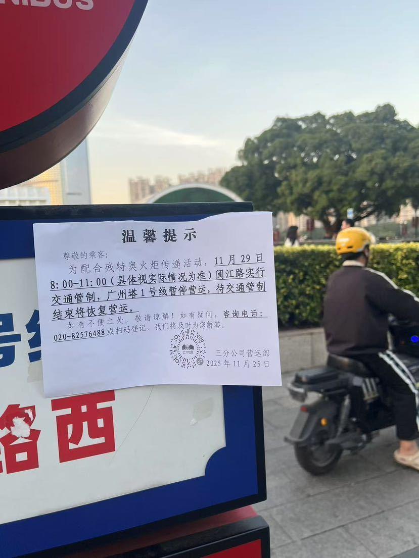 近日,记者了解到,为配合残特奥火炬传递活动,11月29日8:00-11:00(具体视实际情况为准)阅江路实行交通管制,广州塔1号线暂停营运,待交通管制结束将恢复营运。