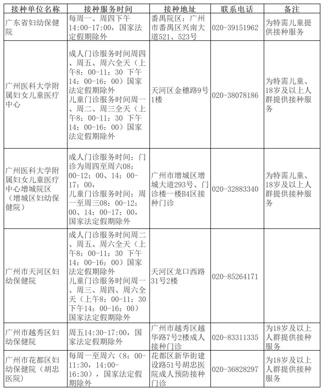 广州市提供流感等疫苗接种服务的妇幼保健机构名单