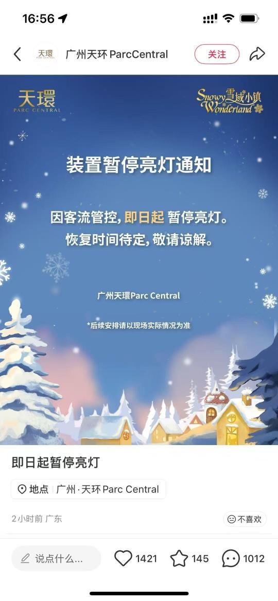 11月30日,“广州天环ParcCentral”官方公众号发布消息,因客流管控,即日起暂停亮灯,恢复时间待定。据了解,该装置11月24日、11月29日晚都曾发布过暂停亮灯通知。