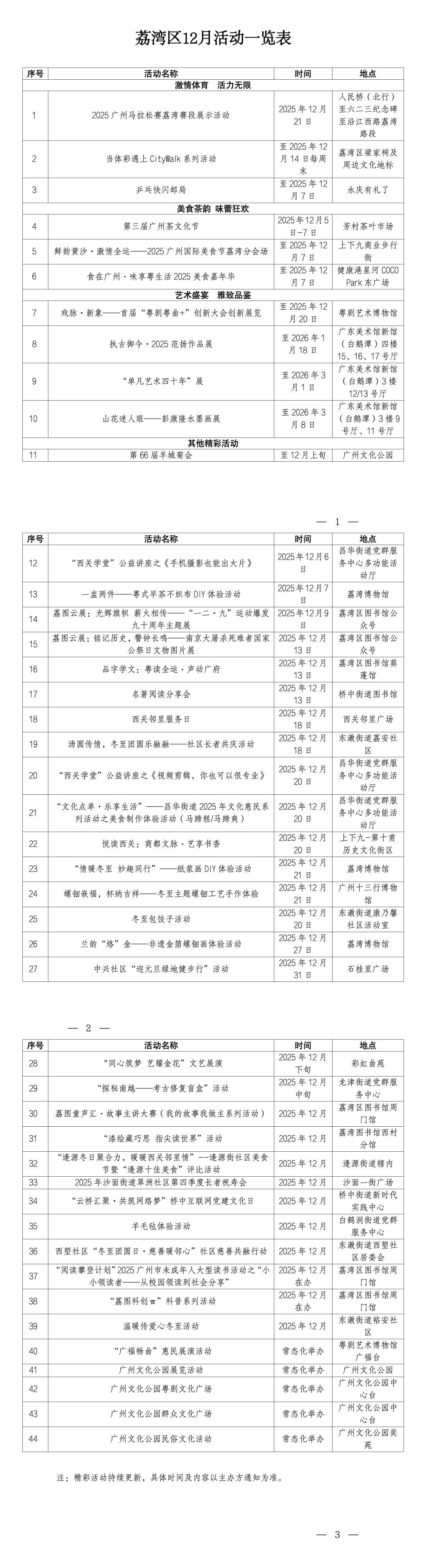 12月,广马开跑激情点燃,美食茶香韵味悠长。广州荔湾区准备了丰富多彩的文化、体育、美食和艺术活动,为市民游客带来温馨热闹的冬日体验。从充满激情的马拉松赛道,到富有意境的艺术场馆;从香气扑鼻的美食街区,到茶香袅袅的茶文化节。这个冬天,邀请您来到荔湾,感受传统与现代交融的独特魅力!