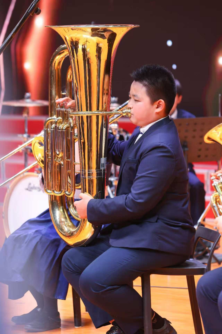 区智燊与音乐的缘分始于幼年,而与大号这位“笨重伙伴”的深度结缘,则是在他8岁就读于广州市白云区方圆实验小学二年级时。选择大号,对于当时个子还不算高的他而言,无疑是一个充满挑战的决定。然而,正是这份与众不同的热爱,让他坚持了下来。多年来,无论是校内的日常管乐团训练,还是校外的专业提升,他都未曾松懈。每日坚持练习,寒暑假积极参加管乐集训营,甚至远赴北京、上海、成都等地参与校际交流与大师课程,这一切都为他扎实的演奏功底和开阔的艺术视野奠定了坚实基础。