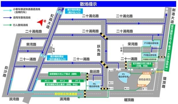 深圳、中山方向自驾观众:建议由深中通道南沙联络线南沙南收费站或南沙湿地收费站下高速(或由万环西路),经虹霞大道前往P5、P6停车场停放,沿行人通道前往南验票口。