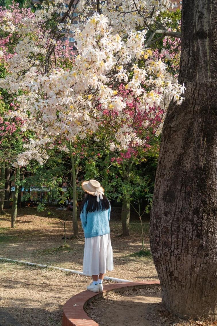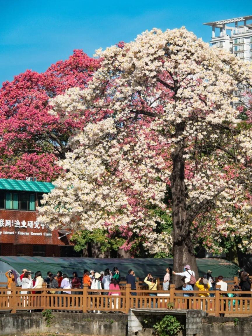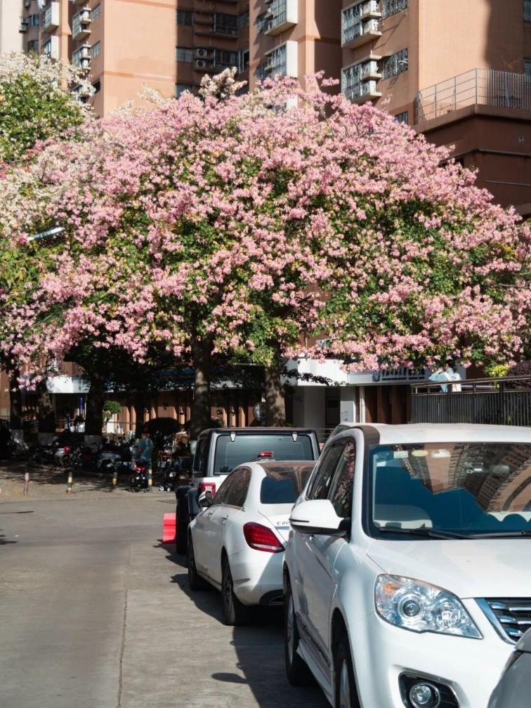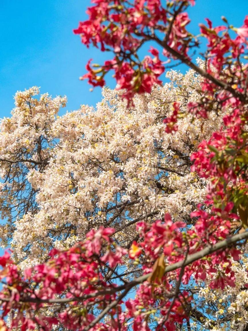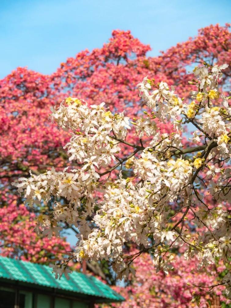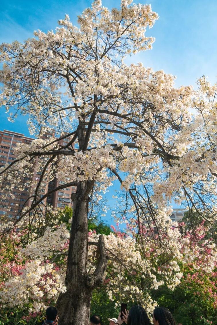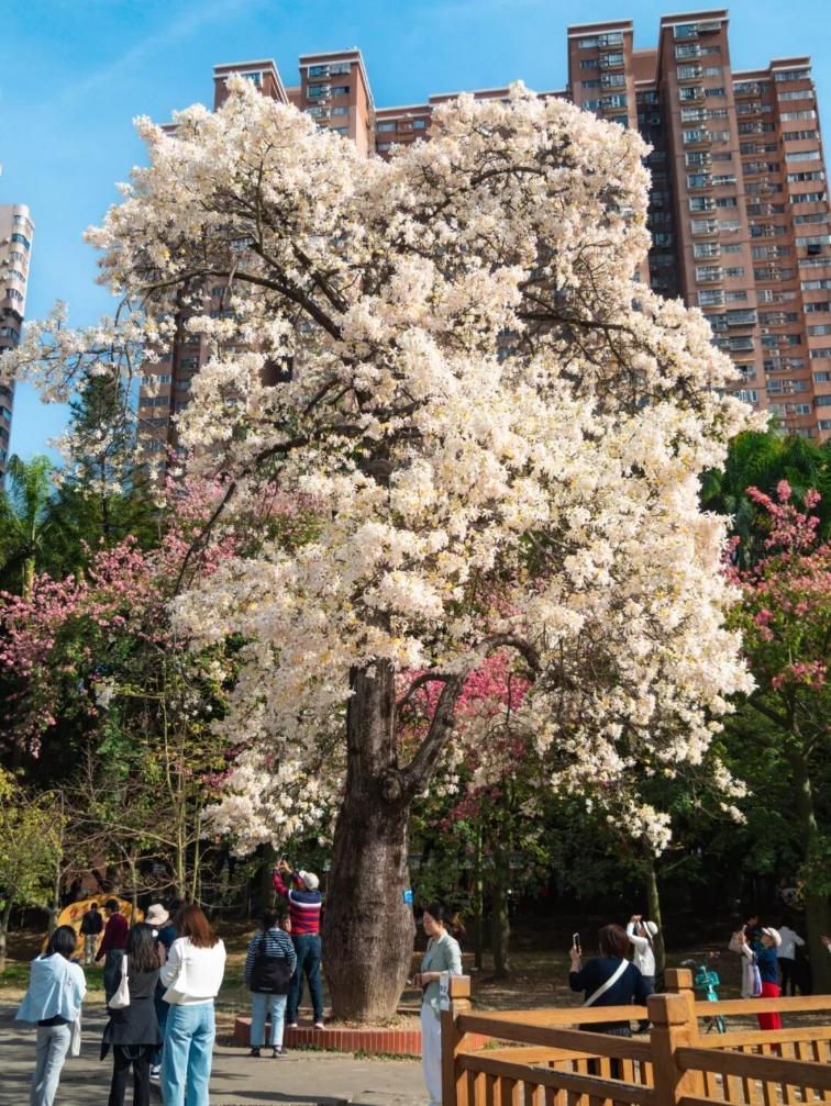 远远望去,满树纯净的白花在阳光下如雪花般晶莹,与周围粉花异木棉交织,构成粉白相间的梦幻画卷。