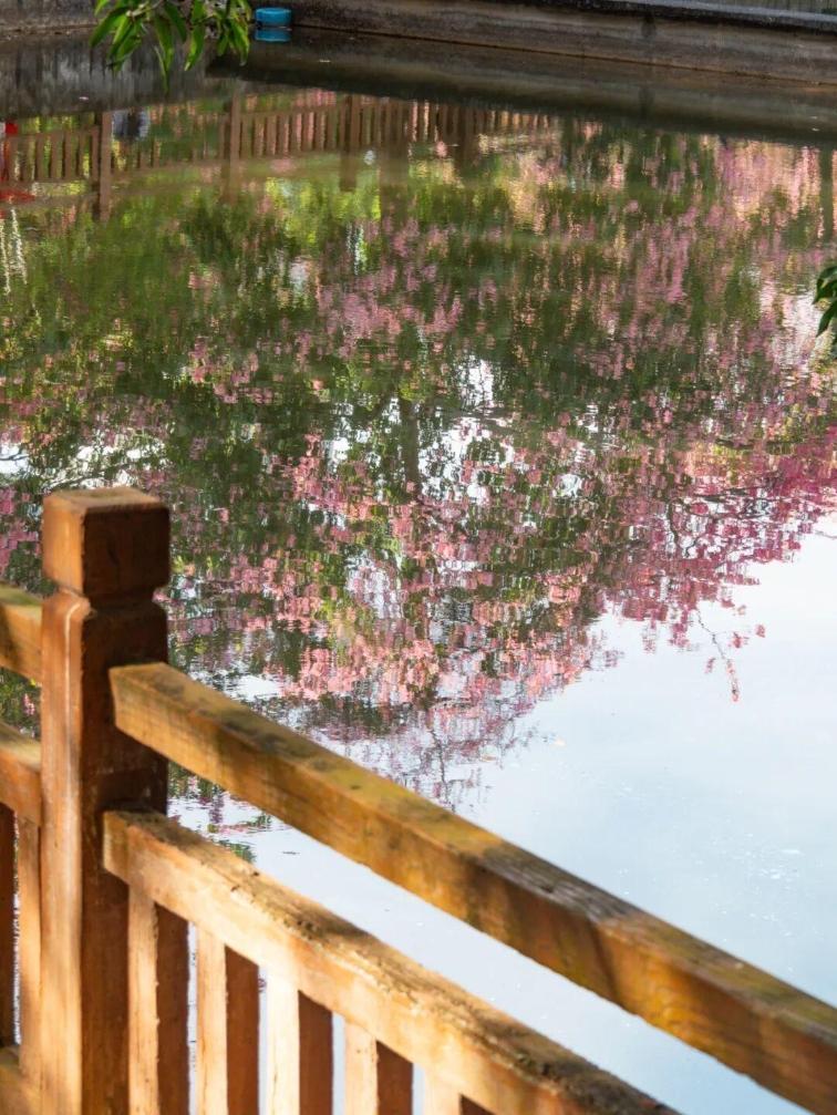 微风拂过,洁白花瓣簌簌飘落,如下起一场温柔的“花瓣雪”,地面草坪与水面上常铺满落花,静谧唯美。