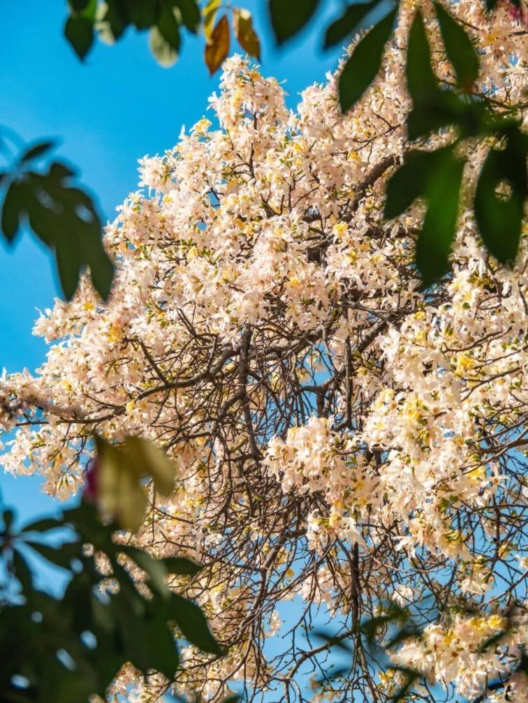 每年11月中下旬至12月初,白花美丽异木棉迎来它的盛花期,相较于粉色品种的美丽异木棉,这棵树开花要稍晚一点。