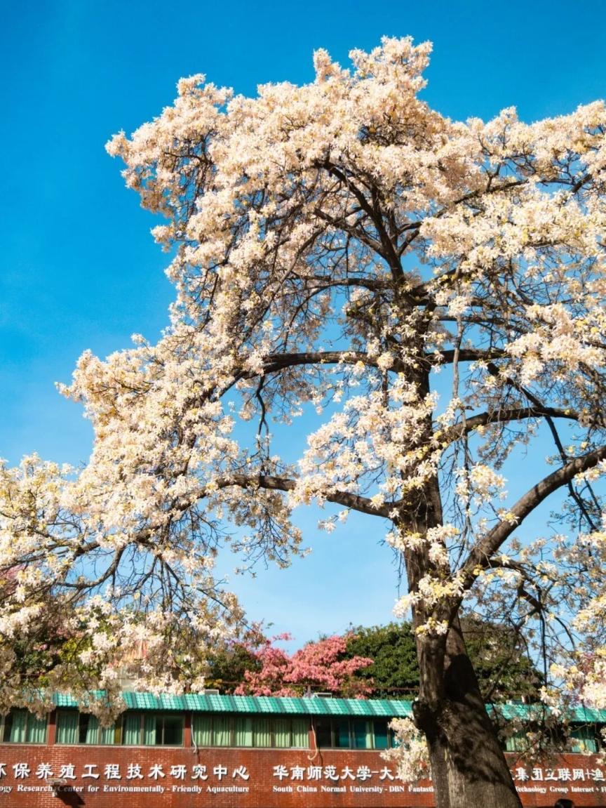 据了解,华南师范大学的美丽异木棉是上世纪80年代栽种在校园里的,它们在此生长已超过四十年。在当年引种的美丽异木棉树苗中,唯有一棵开出了纯白色的花朵,这使得这棵白花美丽异木棉成为整个岭南地区非常稀有的一棵,被大家亲切地称为“白雪公主”。