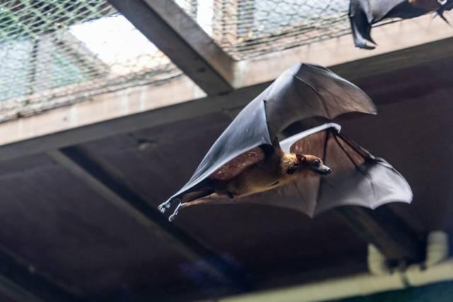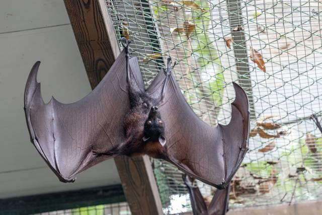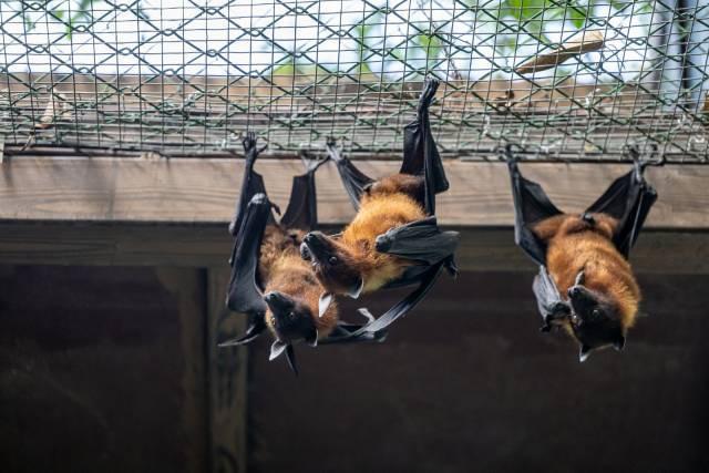 狐蝠展区内,体型庞大的马来大狐蝠悬挂休憩时翼膜收拢,形如深色皮裘,展翅活动时,其接近两米的翼展令人惊叹。而在另一侧,有着棕红色皮毛、面庞似狐、体型稍小的印度狐蝠则显得更为灵动。长隆鸟类保育专家严淦才介绍,马来大狐蝠是世界上体型最大的蝙蝠之一,主要分布在印度尼西亚与马来西亚等地,由于非法猎杀,种群数量下降明显,已被世界自然保护联盟(IUCN)列为“濒危”(EN)级别,野外种群正面临严峻的生存威胁。