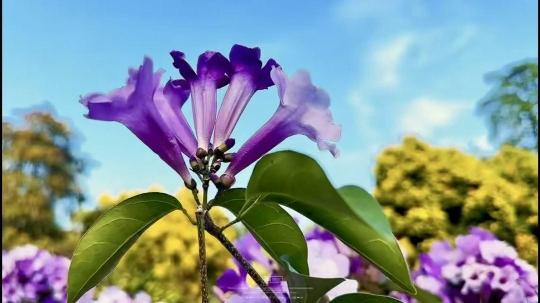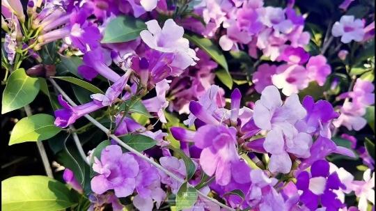 蒜香藤的花朵密集簇拥,从枝条高处垂挂而下,宛如自然挥洒的浪漫笔触。走近细观,淡紫色至深紫色的喇叭状花朵在阳光下熠熠生辉。更特别的是其独特气息:凑近细嗅,浓烈蒜香与温柔花香交织融合,形成一种令人沉醉的独特味道。