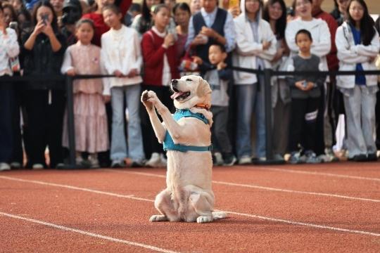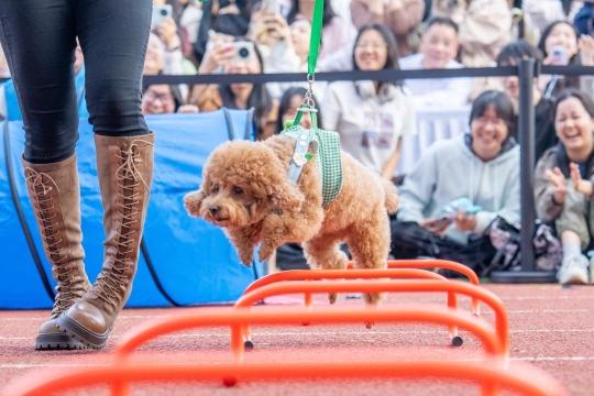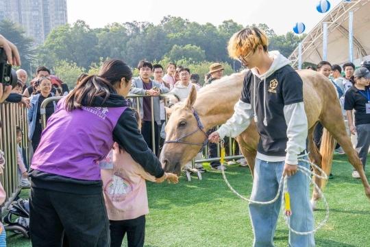 在训导员的指令下,搜救犬展示了护卫、搜爆、搜救等技能,准确完成了腾跃、转向、接盘等一系列动作,展现出高度的专业性与训练素养。宠物服饰展示环节,可爱的“毛孩子”们或身着“疯狂动物城”主题服饰、或头戴中式簪花、或身着华丽礼服,百变造型令人眼花缭乱。萌宠运动会上,主人带领宠物绕柱、钻洞、跨栏,引得观众纷纷拍照记录。华农紫荆马协则将学校饲养的骏马“摩卡”带到现场,向观众们科普马的相关知识。