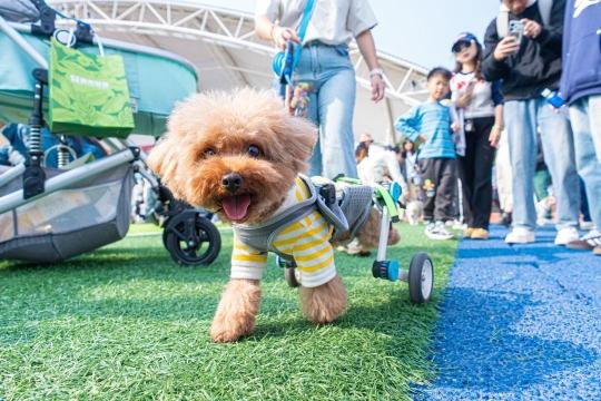 小狗“奔奔”坐着特制的轮椅,在草地上灵活移动,吸引了许多目光。在被发现时,它的腰部已经遭受了严重压伤。不过,在主人张卉的精心照料下,奔奔的病情已经有了不少好转,性格也变得愈发开朗活泼。还有游客将机器狗带到现场,令不少好奇的小狗上前观察、嗅探。“期末备考的焦虑完全被治愈了!”沉浸式体验“毛孩子”互动后,华农外国语学院2024级学生余延馨发出感慨。
