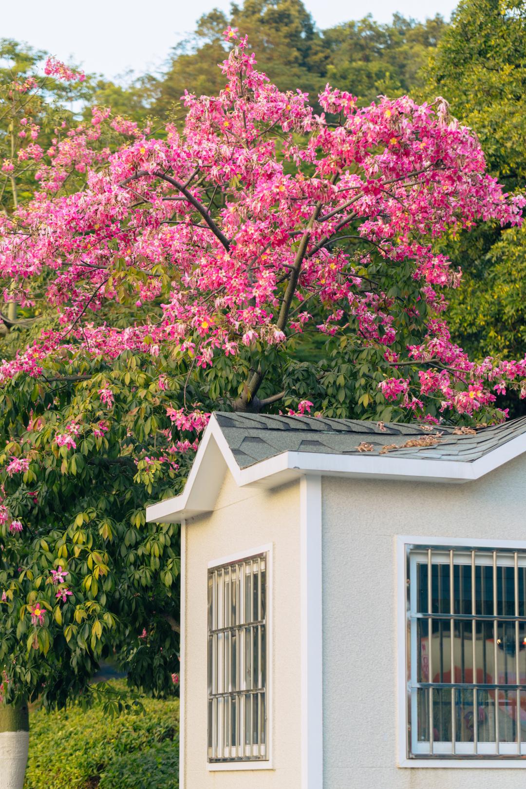 怡园小学口袋公园内的美丽异木棉,在微风中摇曳身姿,悄然绽放间引得行人拍照打卡,绘就了一幅绚丽动人的画卷。