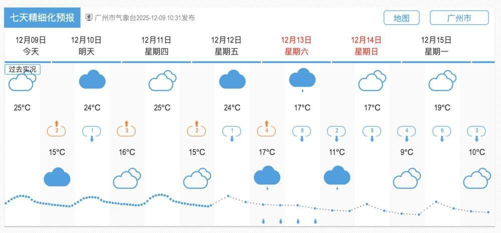 广州市气象台12月9日上午的预报显示,受中等偏强冷空气影响,周末期间广州市区将出现一轮明显降温过程 广州天气网截图