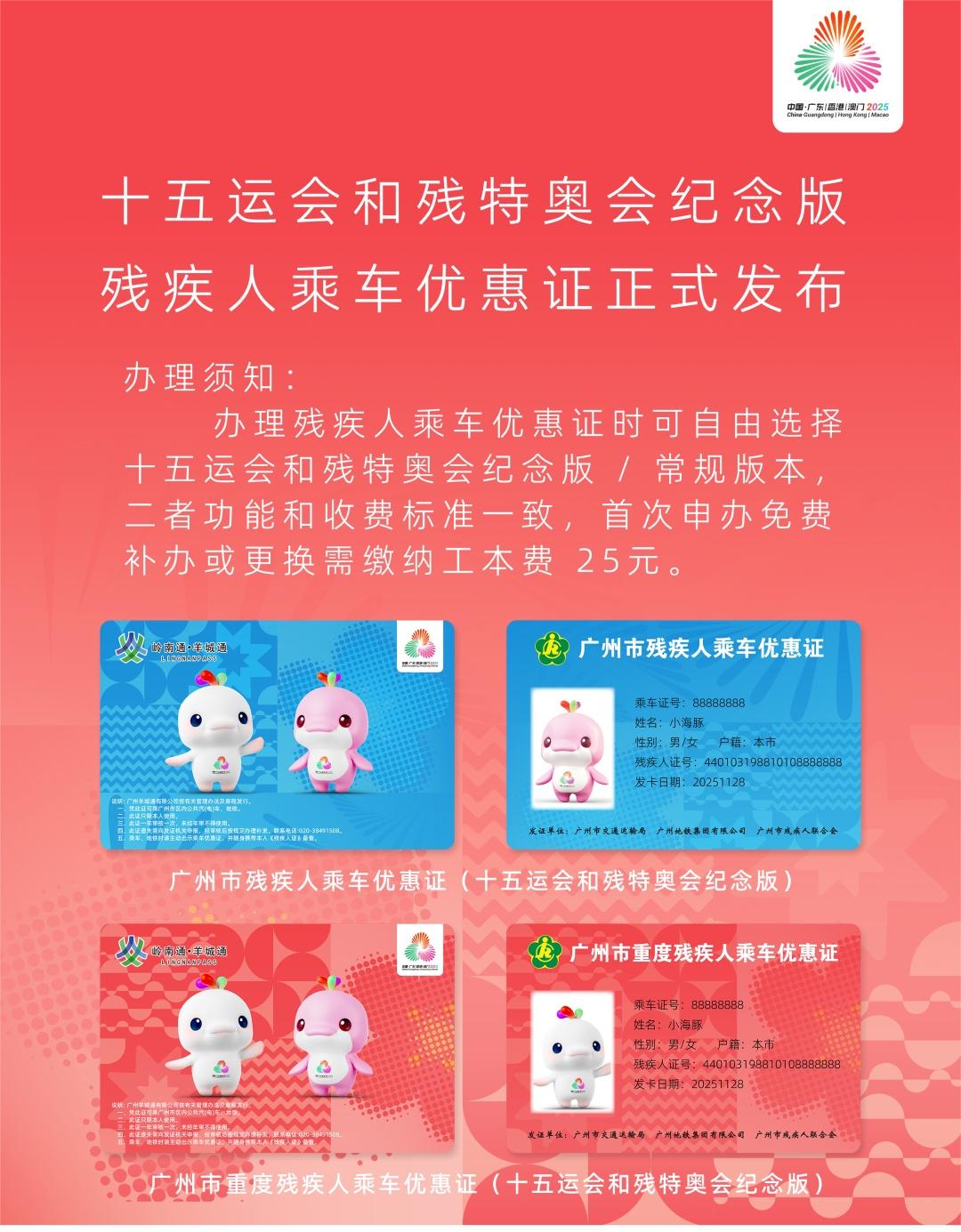 本次发行的十五运会和残特奥会纪念版残疾人乘车优惠证,在保持原有卡片功能与识别要素不变的基础上,特别融入十五运会及残特奥会吉祥物“喜洋洋”“乐融融”等视觉元素,以“温情关怀、融合共享”为设计理念,传递积极向上的体育精神和城市人文关怀。它既是迎接体育盛会、展现广州城市形象的实际行动,也是提升社会关爱人群服务质量的暖心举措,让残障朋友在日常出行中也能感受到浓厚的赛事氛围与社会温暖。