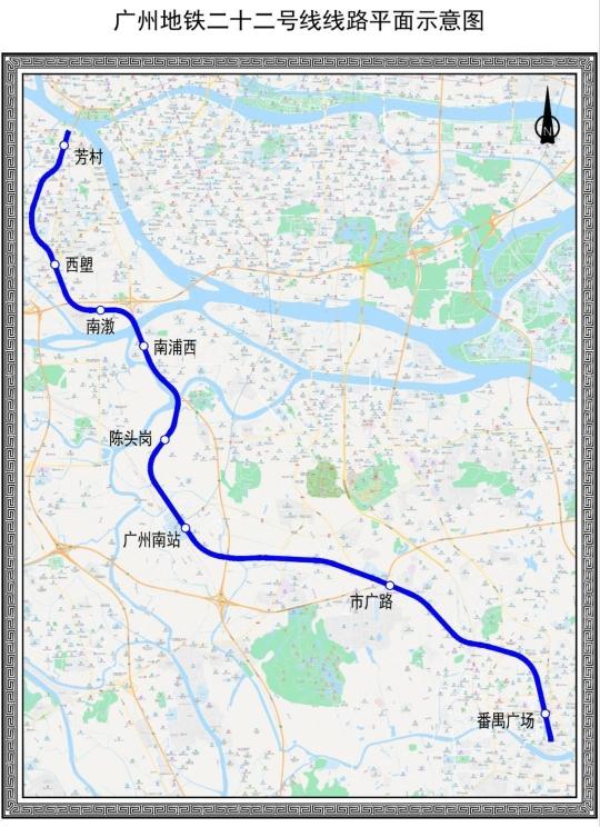 二十二号线全长29.7公里,设车站8座,其中换乘站4座,定位为时速160公里的南站快线。其中,二十二号线首通段(番禺广场-陈头岗)已于2022年3月31日开通运营,后通段(陈头岗-芳村)将于月底开通运营。