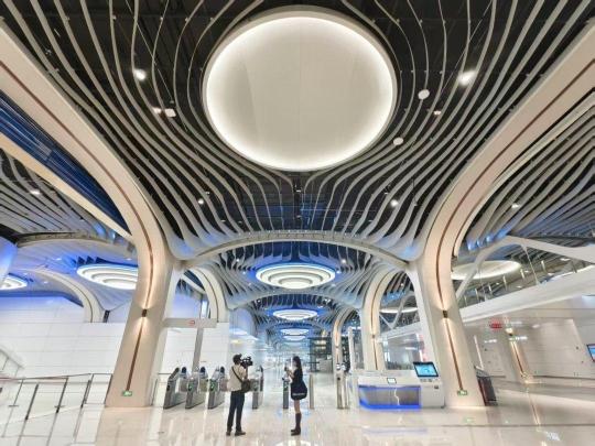 记者来到二十二号线芳村站,进站便看到了一座极具特色的空中艺术廊桥,这是为不进站乘车的市民提供的过街通道,相当于把地下人行通道融入地铁站之中。