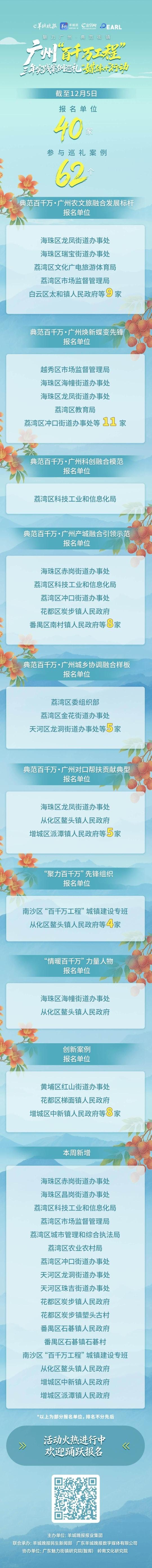 自11月启动“魅力广州·典范街镇——广州‘百千万工程’三年实践案例巡礼‘媒体+’行动”以来,活动已经吸引40家相关单位、共62个案例报名参与巡礼。期待更多的区域发展典范报名参与,借“媒体+”行动碰撞出越来越多的乡村振兴内生动力。