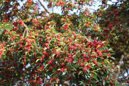 春有香花,秋有红果,铁冬青的四季皆有景致。三月中旬至四月盛花期,黄白色细碎小花芬芳馥郁,引来蜜蜂群集;入秋后果实由绿转橙再变红,迷你似山楂的红果挂枝持久,既是鸟儿的“美食盛宴”,也成为园林观果佳品,果枝插瓶还寓意“鸿运当头”。