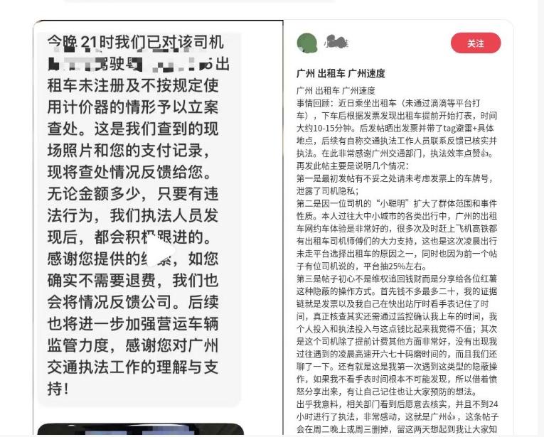 市交通运输局执法部门高度重视群众反映的客运违章线索,安排专人按照“100%核实,100%回复,证据确凿100%查处”的原则快速跟进处置。12月7日,有群众在某互联网社交平台反映其当天早上在广州南站乘坐出租车时,发票显示行车时间比实际情况多了10至15分钟,怀疑有不合理收费。执法人员关注到此线索后,立即根据乘客提供线索开展调查,快速锁定嫌疑车辆粤AA**55,固定当事司机违章行为证据。当晚,执法人员在广州南站布控,成功查获当事司机,对其以不按规定使用计价器予以立案查处。乘客在收到处理结果反馈后,为广州交通运输执法部门办事作风和处置效率点赞。