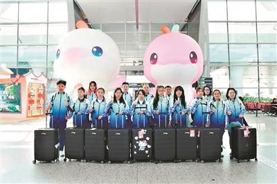 四川盲人女足在十五运会吉祥物打卡点合影。广州日报全媒体记者章程 摄