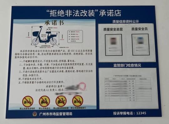 在检查电动自行车销售门店经营情况方面,广州市场监管部门查资质公示,核验门店营业执照是否有效,检查是否醒目公示“拒绝非法改装”承诺等;查产品合规,核对车辆CCC认证标志及产品合格证有效性,携带台秤、尺具现场核查整车重量、尺寸,比对整车编码、电动机、蓄电池、控制器、充电器等关键信息与合格证信息一致性;查非法改装,对照合格证简图核查车辆外观,排查破解限速装置、改装电动机、控制器、蓄电池等违规行为;查规范管理,督促门店落实进货查验、索证索票、台账管理,规范“一车一池一充”陈列要求。