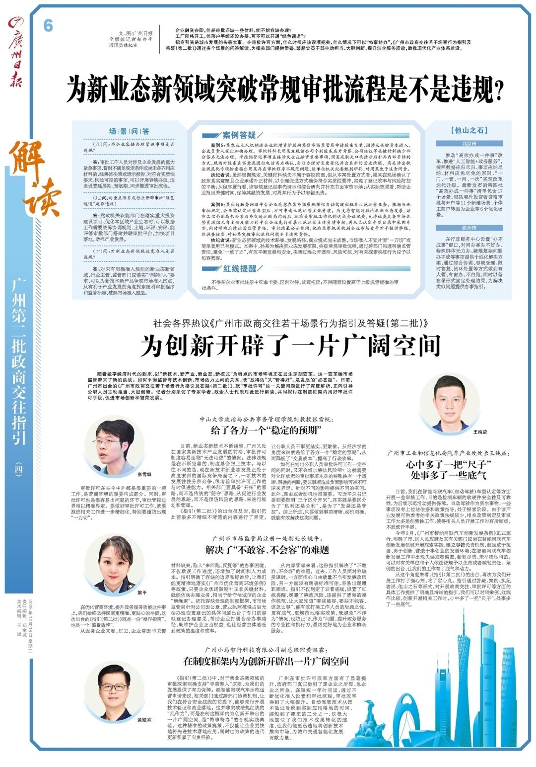 随着数字经济时代的到来,以“新技术、新产业、新业态、新模式”为特点的市场环境正在发生深刻变革。这一变革给市场监管带来了新的挑战。如何平衡监管与技术创新、市场活力之间的关系,既“放得活”又“管得好”,是发展的“必答题”。日前,广州市出台的《广州市政商交往若干场景行为指引及答疑(第二批)》,就“审批许可”这一关键问题进行了深度解析,正向引导公职人员主动担当、大胆创新。记者分别采访了专家学者、政企人士代表对此进行解读,共同探讨在制度框架内用好审批许可手段,促进市场创新和繁荣发展。