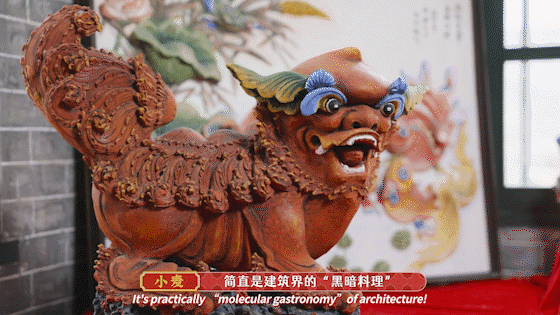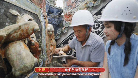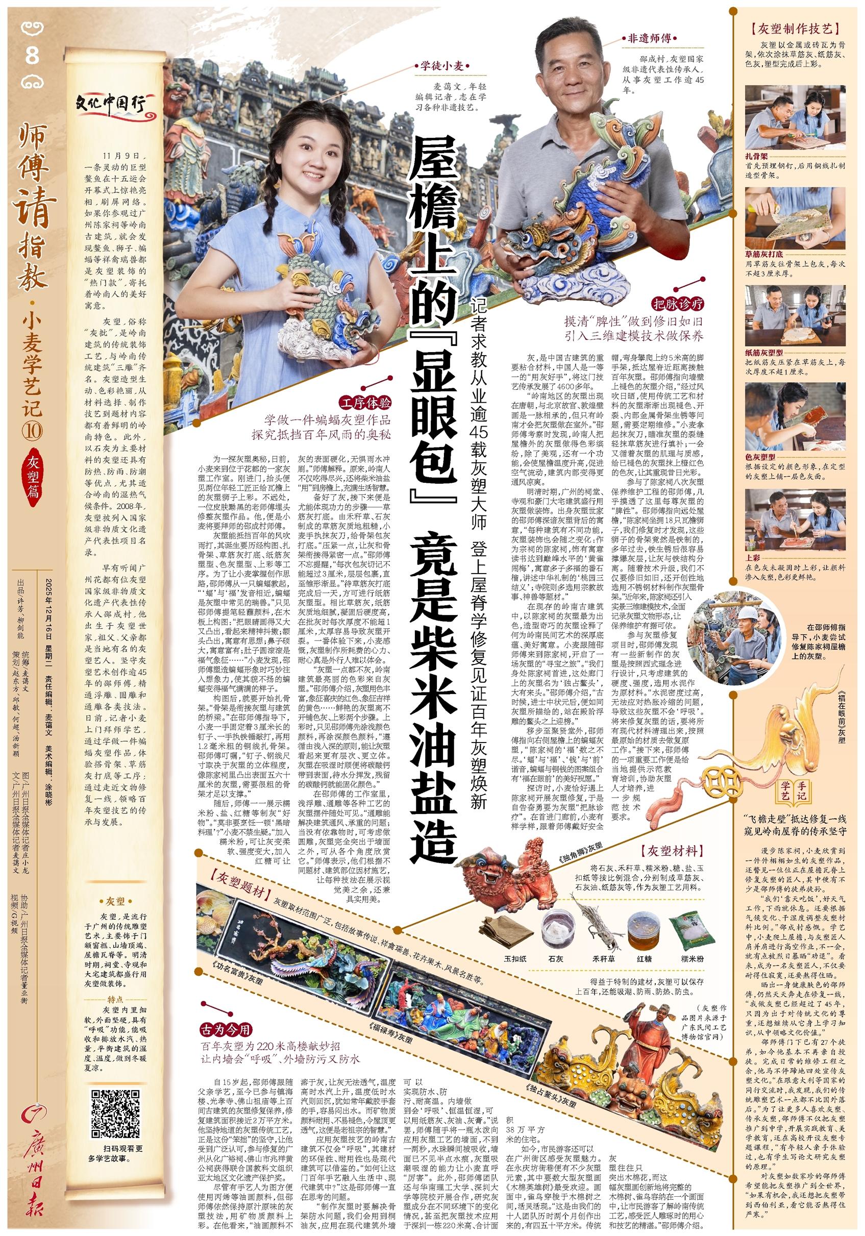 漫步陈家祠,小麦欣赏到一件件栩栩如生的灰塑作品,还瞥见一位位正在屋檐瓦脊上修复灰塑的匠人,其中便有不少是邵师傅的徒弟徒孙。