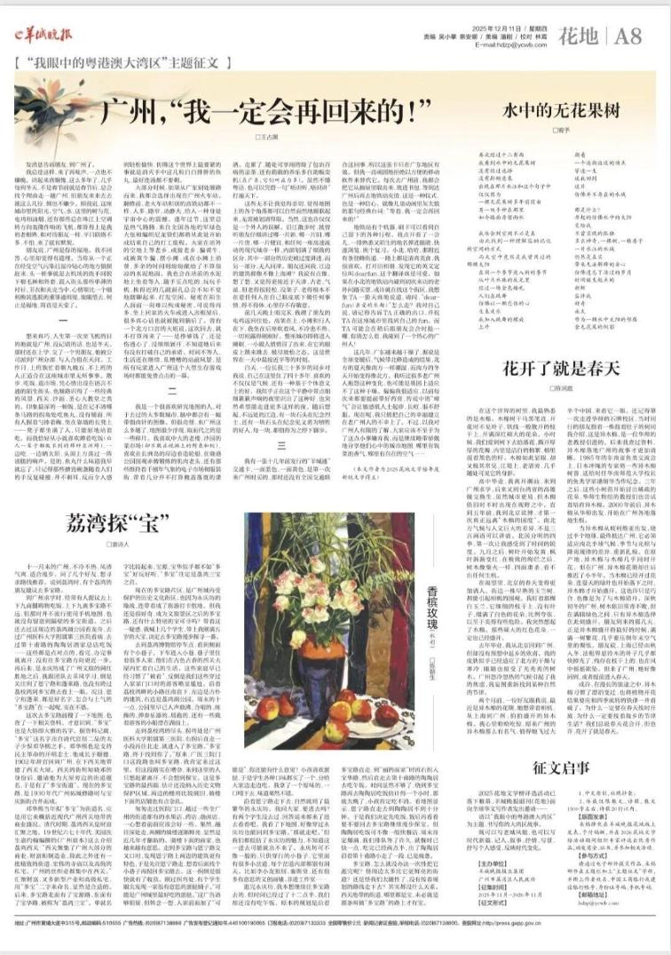 (本文作者为2025花地文学榜年度新锐文学得主王占黑,文章原刊于《羊城晚报》12月11日A8花地版“我眼中的粤港澳大湾区”主题征文,原标题为《广州,“我一定会再回来的!”》,图片来源:羊城晚报·羊城派)
