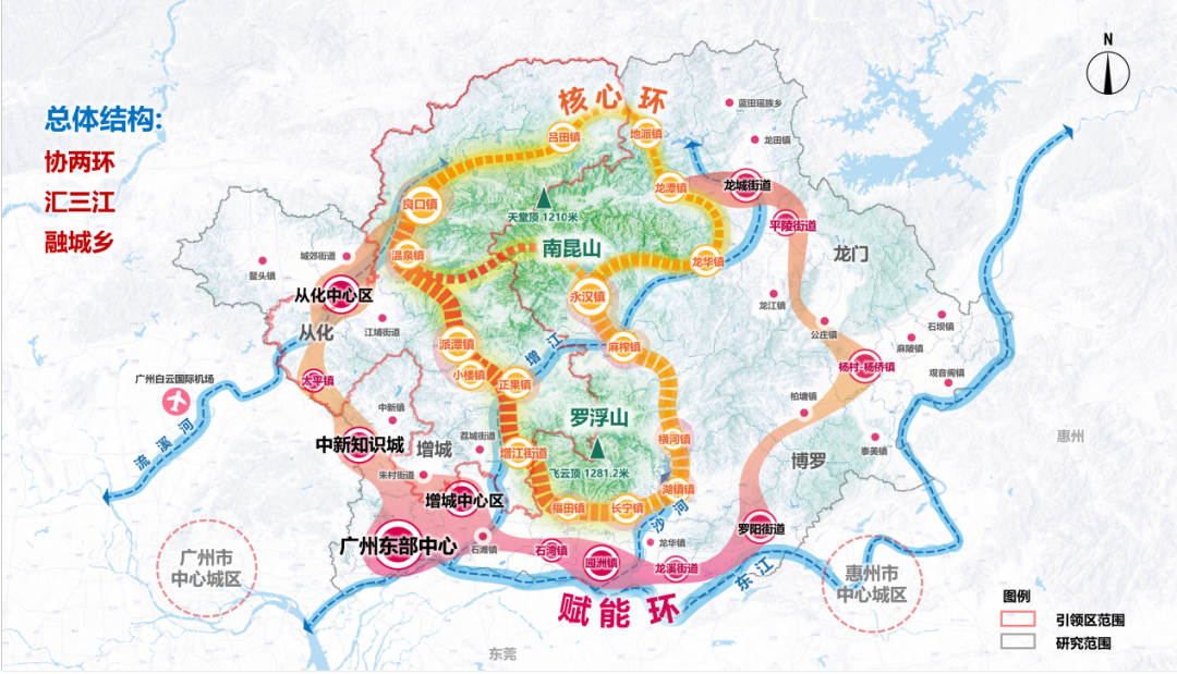 《规划》提出“协两环、汇三江、融城乡”的总体结构,发挥广州国家重要的中心城市、超大城市的赋能带动作用,推动产业、人才、资金、配套等各类城乡要素流动,纵深传导带动引领区生态价值转化,推动区镇村现代化、特色化、差异化协调发展。依托流溪河高质量发展带、增江绿美经济带以及东江三条水脉,守护水生态,弘扬水文化,发展水经济。推动建设“大分散、小集中、强链接”的区镇村联动发展格局,构建“区中心+特色镇街+典型村”的强区促镇带村的三级示范。