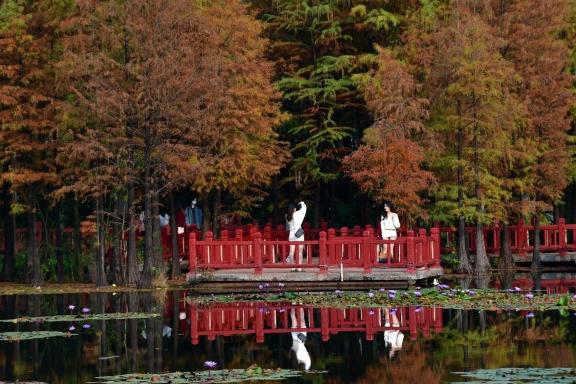 广州市黄埔区创业工业的水杉红了,市民在水杉林的木栈道上拍照打卡。