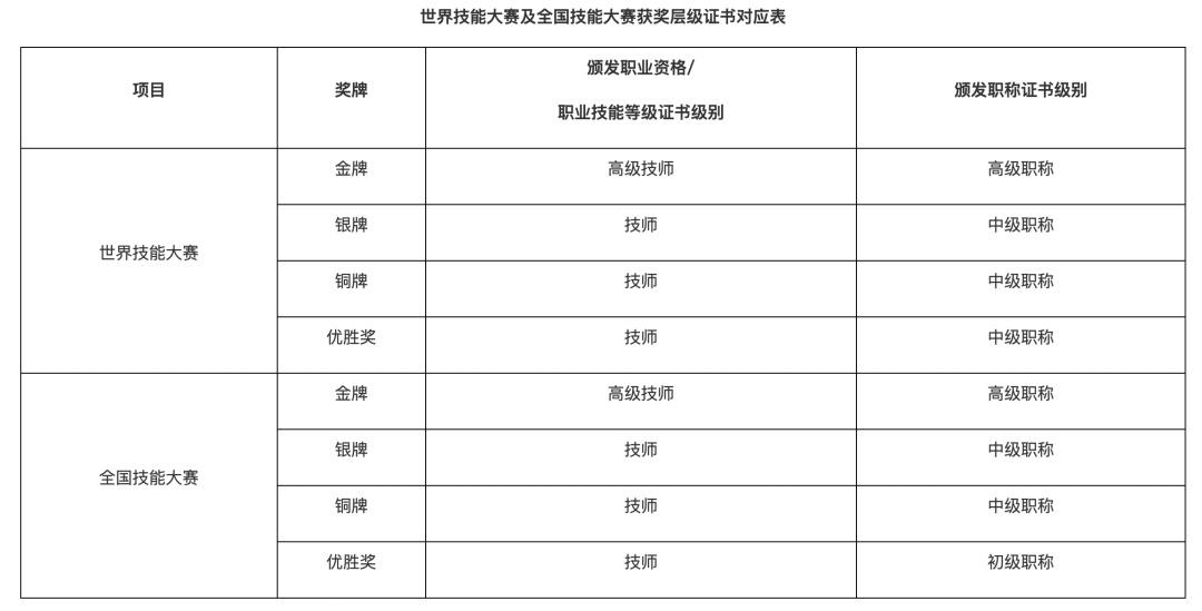 《方案》提出,推动建立“以赛代评”人才评价模式。持续完善职业技能竞赛激励机制,探索在世界技能大赛、全国技能大赛获得优胜奖以上的选手,按规定颁发技师、高级技师职业资格或职业技能等级证书,具有广州市企业满1年及以上工作经历或毕业后在广州市企业工作满1年的对应颁发中级职称、高级职称证书。