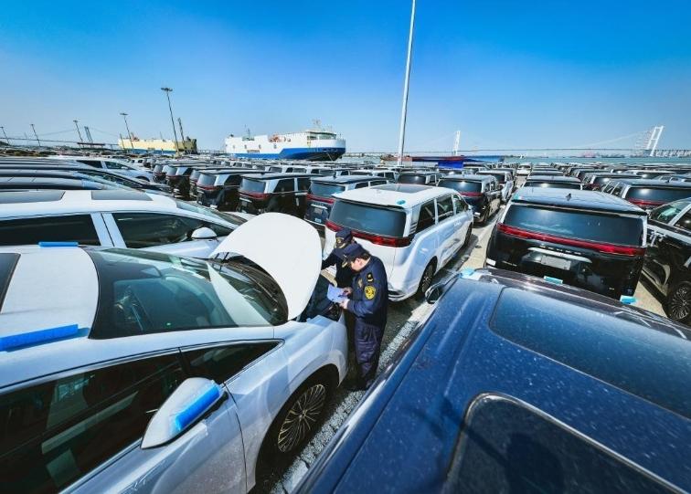 广州海关所属南沙海关关员对出口汽车进行监管。