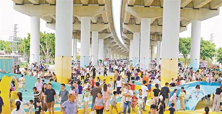 “每天早上骑10分钟电动车带娃来玩,攀岩、滑滑梯、蹦蹦床都有,开心!”家住广州南沙东涌镇马克村附近的王婆婆,指着马克村桥下公园里奔跑的孩子笑着说。这座今年5月1日对外开放的公园,曾是堆满杂物的闲置桥底,如今日均游客超6000人次,“五一”期间更是创下日均1万人次的纪录,正成为周边村民乃至珠三角游客的“打卡胜地”,也让这个村庄的活力彻底迸发。