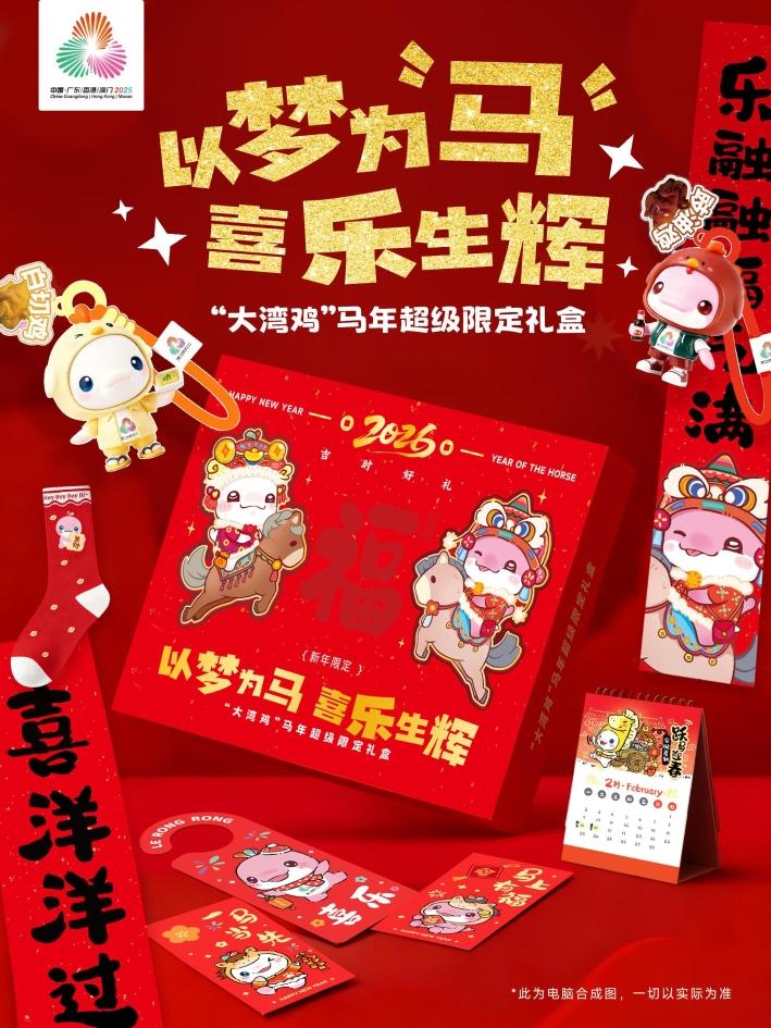 本次发布仪式上,“湾鸡跃马”主题新春限定新品将惊喜亮相,三大系列好物精准拿捏岭南年味与潮流萌趣,让新年仪式感拉满。“湾鸡跃马马上有”盲盒&新春礼盒堪称盲盒控的福音,4个常规款承载实用祝福,2个特别款加码将欢乐加倍;配套新春礼盒内含红底金字的大湾鸡定制对联与萌趣红包,颜值与心意双在线,轻松拉满居家年味。“烟火萌趣”挂饰系列则让岭南美食触手可及,白切鸡、酱油鸡、虾饺等地道美味化身精致挂饰,还原度拉满且萌态十足,让湾区烟火气随身相伴。压轴的“湾鸡赤骏”贺岁版毛绒系列更具温度,身披赤焰战甲的“湾鸡赤骏”,挂于背包或置于书桌,皆能赋予满满的安全感与前行动力。