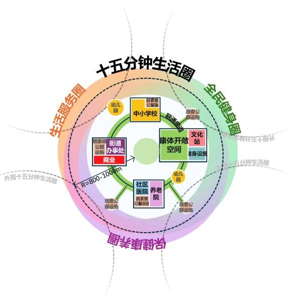 《指导意见》将公服设施步行15分钟可达作为一个基本单元,一直是公服规划建设的核心理念。本次《指导意见》不止步于打造泛化的“生活圈”,而是在夯实“15分钟社区生活圈”的基础上,拓展“生活服务圈”“全民健身圈”“保健康养圈”3类主题服务圈,统筹优化文化、教育、体育、医疗、养老及商业等服务设施设置,构建人人可享、处处可达、时时可感的高品质生活圈。