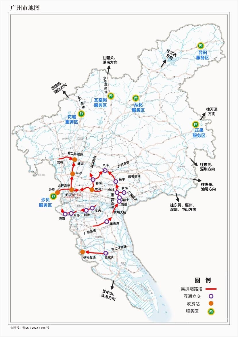 具体路段上,北环高速、北二环、机场高速、广河高速、华南快速等互通立交、路段交汇处及隧道等瓶颈路段,因短时车流聚集,易出现局部交通缓行情况。此外,增天高速在节前全线通车,将有效提升广州东部对外互通互联能力,一定程度缓解广河高速、北三环高速、北二环高速的交通压力。
