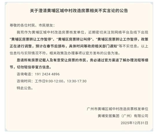 12月31日,黄埔安居发布一则“关于澄清黄埔区城中村改造房票相关不实言论的公告”。