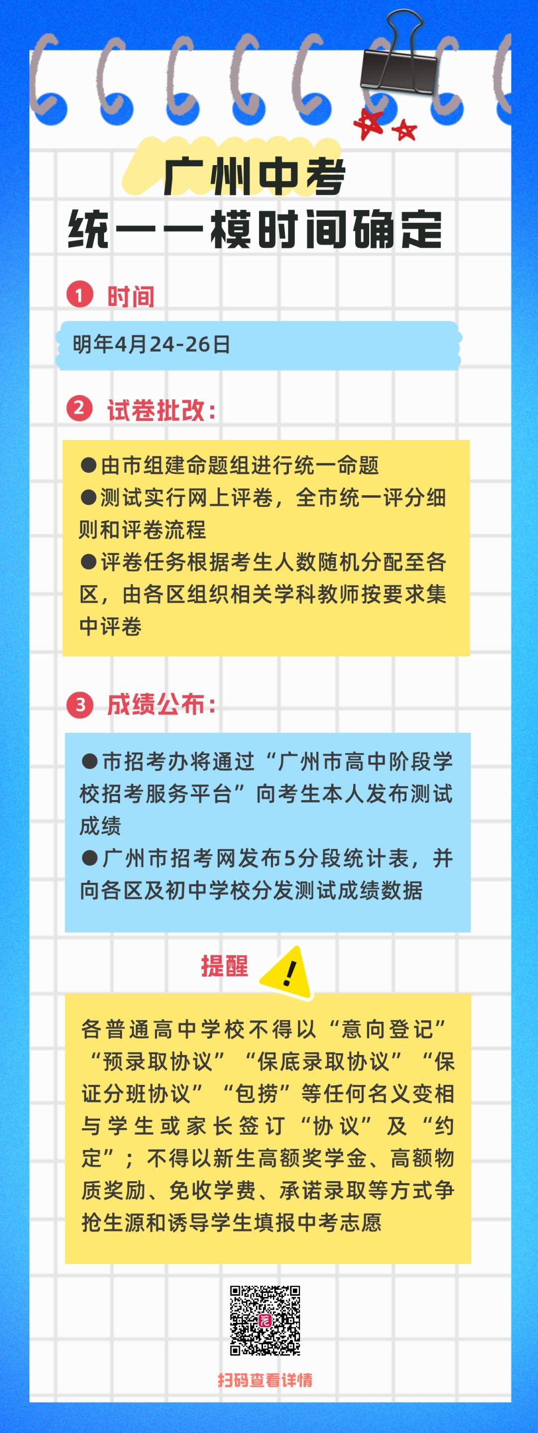 12月31日,广州市教育局发布了关于开展2026届初三毕业班适应性测试的通知,决定组织开展1次广州市初三毕业班市级适应性测试(以下简称“测试”)。据悉,2026年4月24日至26日,2026届初三毕业班学生,将进行语文、数学、英语、道德与法治、历史、物理、化学科目的适应性测试。由市组建命题组进行统一命题,实行网上评卷,全市统一评分细则和评卷流程。考后将公布5分段统计表,向各区及初中学校分发测试成绩数据。
