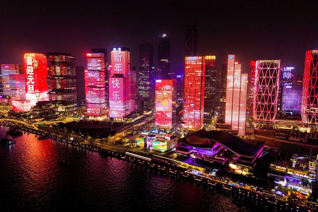 图为12月31日晚,广州珠江两岸建筑亮起主题灯光秀。