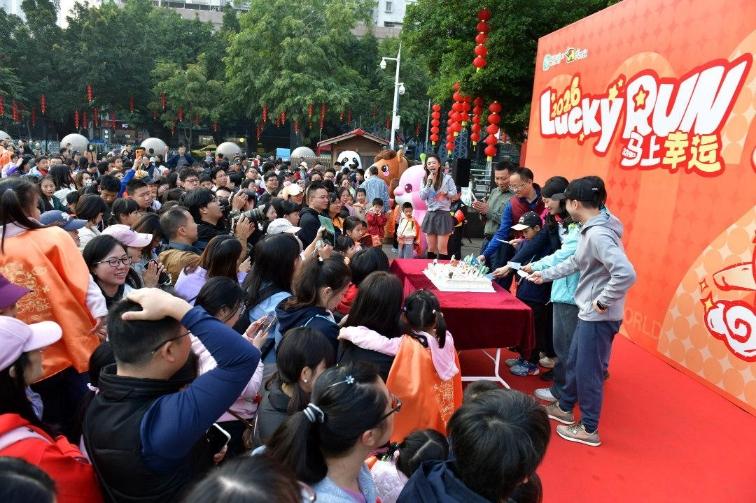 元旦8时,新年第一缕阳光洒满广州动物园南门广场。园方邀请同为元旦生日的市民一同切开生日蛋糕,设现场抽奖环节,送出精心设计的2026年限定年卡,点燃全场氛围。