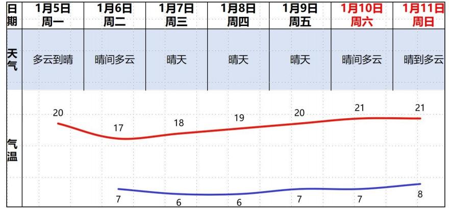 1月5日,市防汛防旱防风总指挥部办公室与市气象局对我市的气象水文情况进行了会商。会商结论意见指出,预计,1月份我市出现寒潮可能性较小,18日-20日、27-29日受中等强度冷空气影响,北部山区可能出现霜冻天气。预计,1月5日,气温继续缓慢回升;6日-8日,受新一股弱冷空气补充影响,晴天为主,气温又小幅下降;9日起,晴间多云,气温再次缓慢回升。