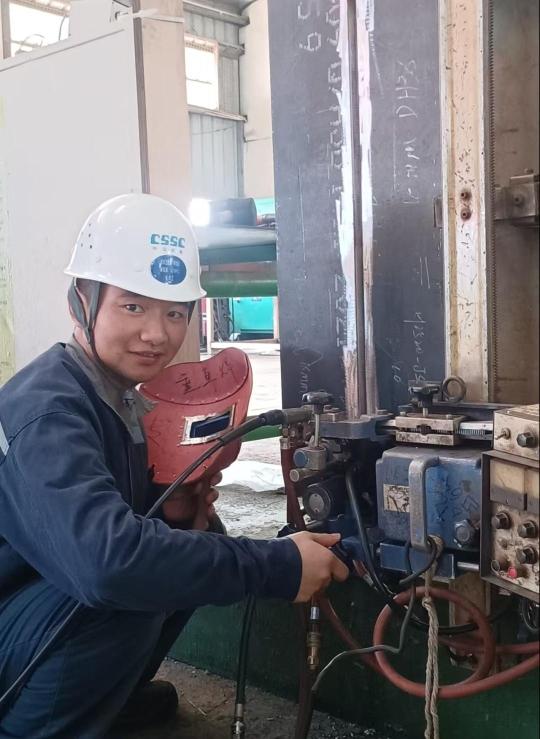 谢祖靠正在进行双丝垂直气电焊焊接工作