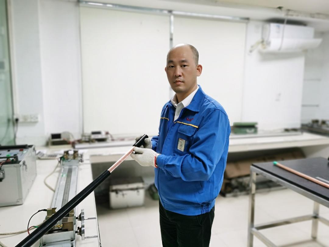 李楷东正在检验15kV交联聚乙烯绝缘电力电缆绝缘层偏心度