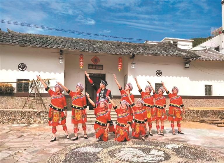畲族村村民在祠堂前表演舞蹈