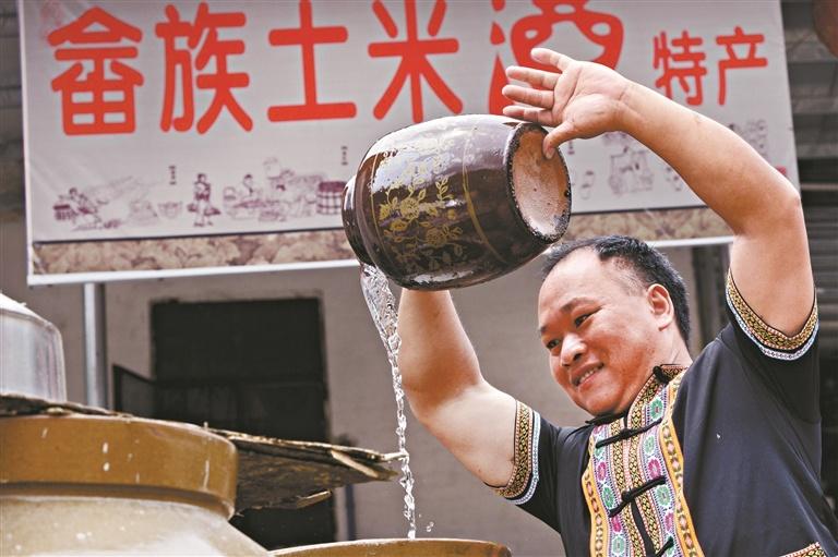 在畲族风情街,除了枇杷醋飘香,畲族米酒也香气扑鼻。蓝均玉打开一大缸,畲族米酒香气沁人心扉。酿造米酒是正果畲族祖祖辈辈传下来的习俗,畲族人称其“土莲香”。畲族村独特的地理环境赋予了米酒别样的风味。雷映霞介绍说,畲族村虽小,但有9家酿造畲族米酒的作坊。畲民坚持使用罗浮山泉水酿造,用木柴煮米,用陶罐发酵,让畲族米酒有“柴味”及“米香”,分外醇正。