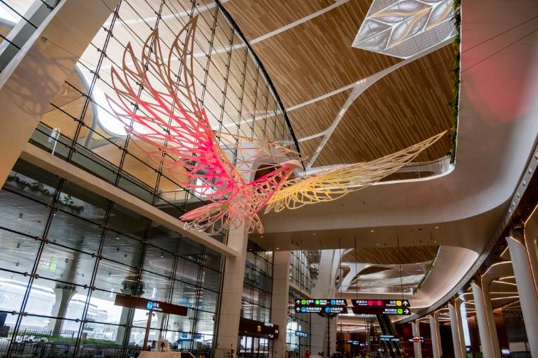 在白云机场T3航站楼到达厅的上方,有一对展翅飞翔的“神鸟”艺术装置,为您接风洗尘,这是白云机场为来到广州的客人准备的诗意见面礼。