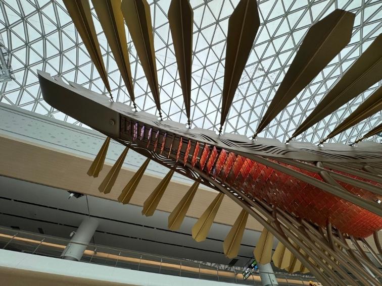 在这里,每一次出发与抵达,都不再只是行程的节点,而是一场融汇国际表达与岭南气韵的沉浸式艺术漫游。国际顶尖艺术家的匠心创作,让传统焕发新生;前沿科技的融入,让文化以动态可感的方式“活”在当下。机场建设者怀着对历史的尊重、对开放的追求、对未来的眺望,将这座航空新地标,打造成一个融合东方哲思与全球视野的“公共艺术生长系统”。在这里,国际审美与广府情调从容对话,在地文化与当代艺术交织。