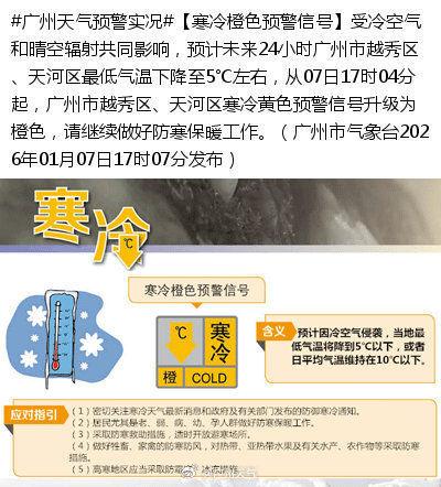 广州市气象台1月7日17时07分消息,受冷空气和晴空辐射共同影响,预计未来24小时广州市越秀区、天河区最低气温下降至5℃左右,从07日17时04分起,广州市越秀区、天河区寒冷黄色预警信号升级为橙色,请继续做好防寒保暖工作。