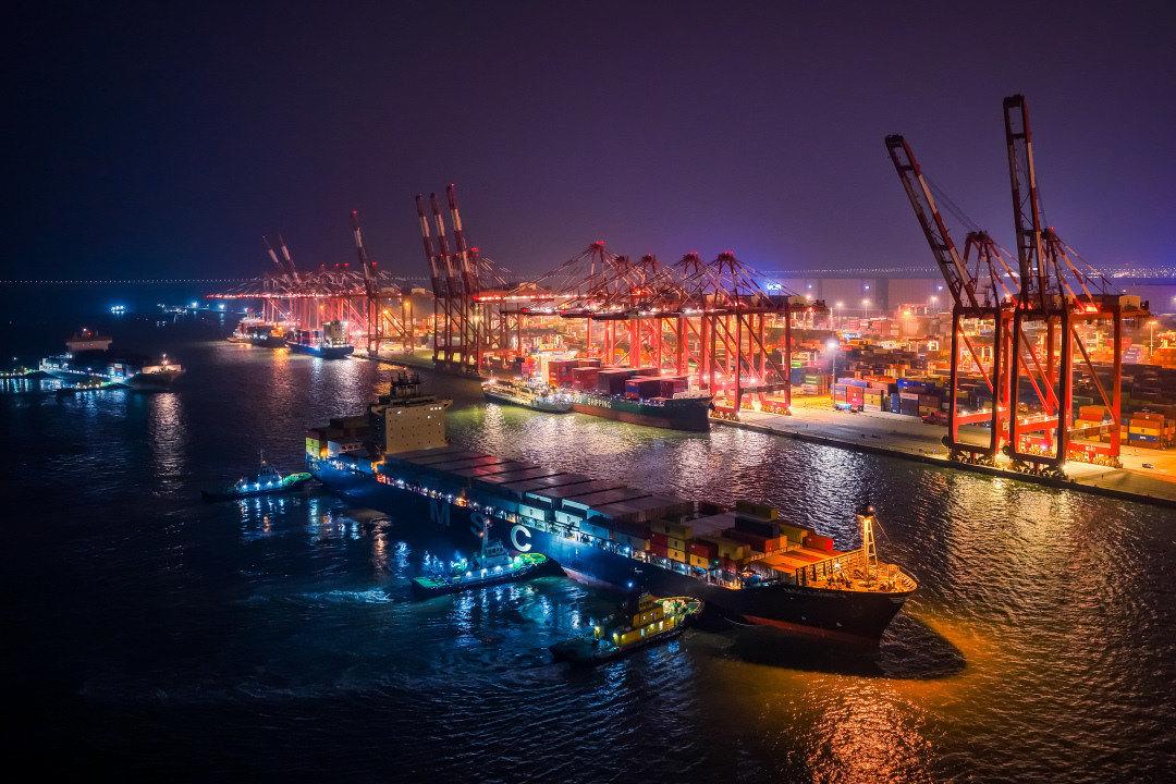 滚装船旁,国产新能源汽车高效集港发运,抵港后等待上牌时间从14个工作日压缩至3日内……