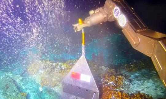 “源火”采集成功后,科研人员通过“海马”号在海底采集点位放置“十五运会与残特奥会‘源火’采集点”永久基点定位标,纪念这次具有开创性的“源火”采集行动。图/广州日报新花城记者 莫伟浓