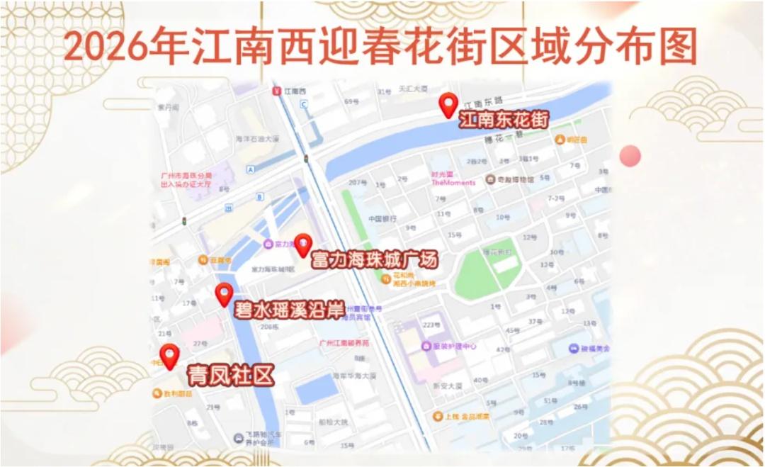 2026年江南西迎春花街整合江南东花街、富力海珠城、瑶溪花市(青凤社区)三大区域,精心绘制动态游览图。